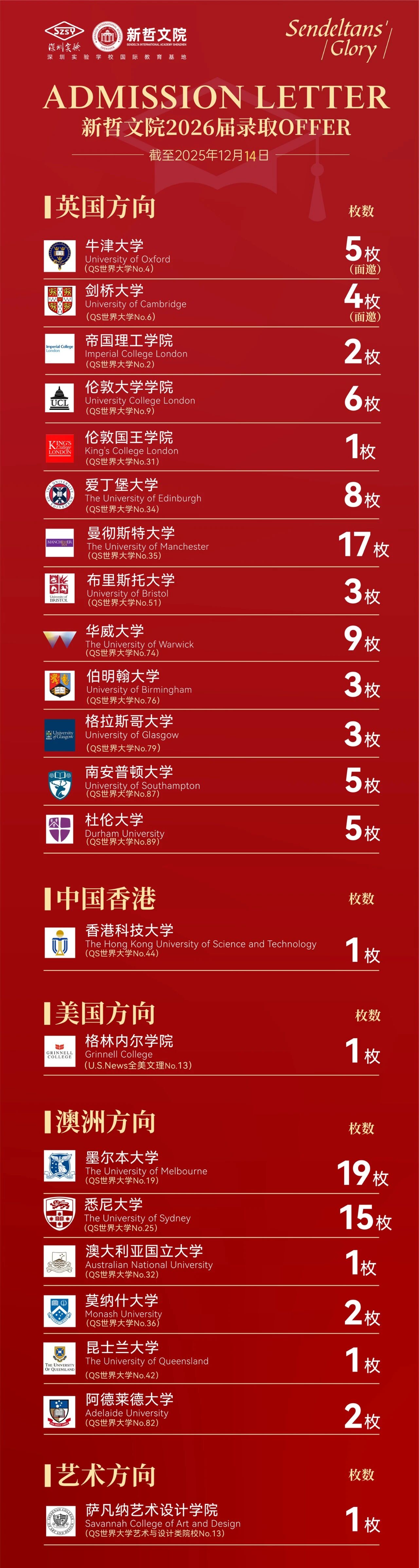 截至今日,新哲学子已斩获逾百封世界名校录取通知,以势如破竹之姿领跑2026录取季: