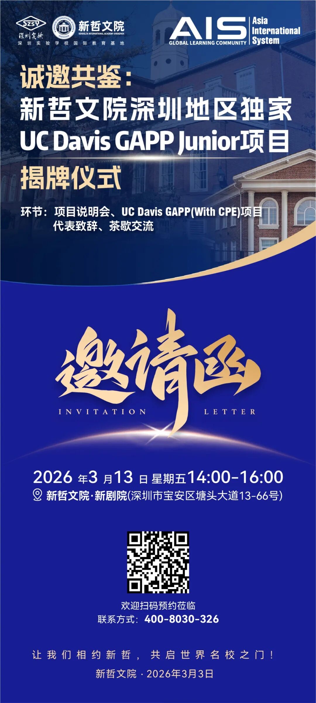 3月13日,新哲文院深圳地区独家UC Davis GAPP Junior项目揭牌仪式即将举办,我们诚挚邀请各位家长朋友、教育同仁扫码预约莅临,共同见证这一具有里程碑意义的教育盛事。